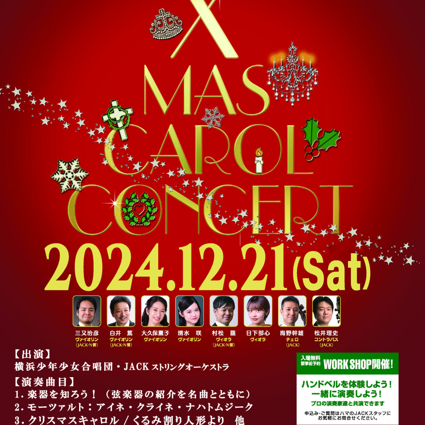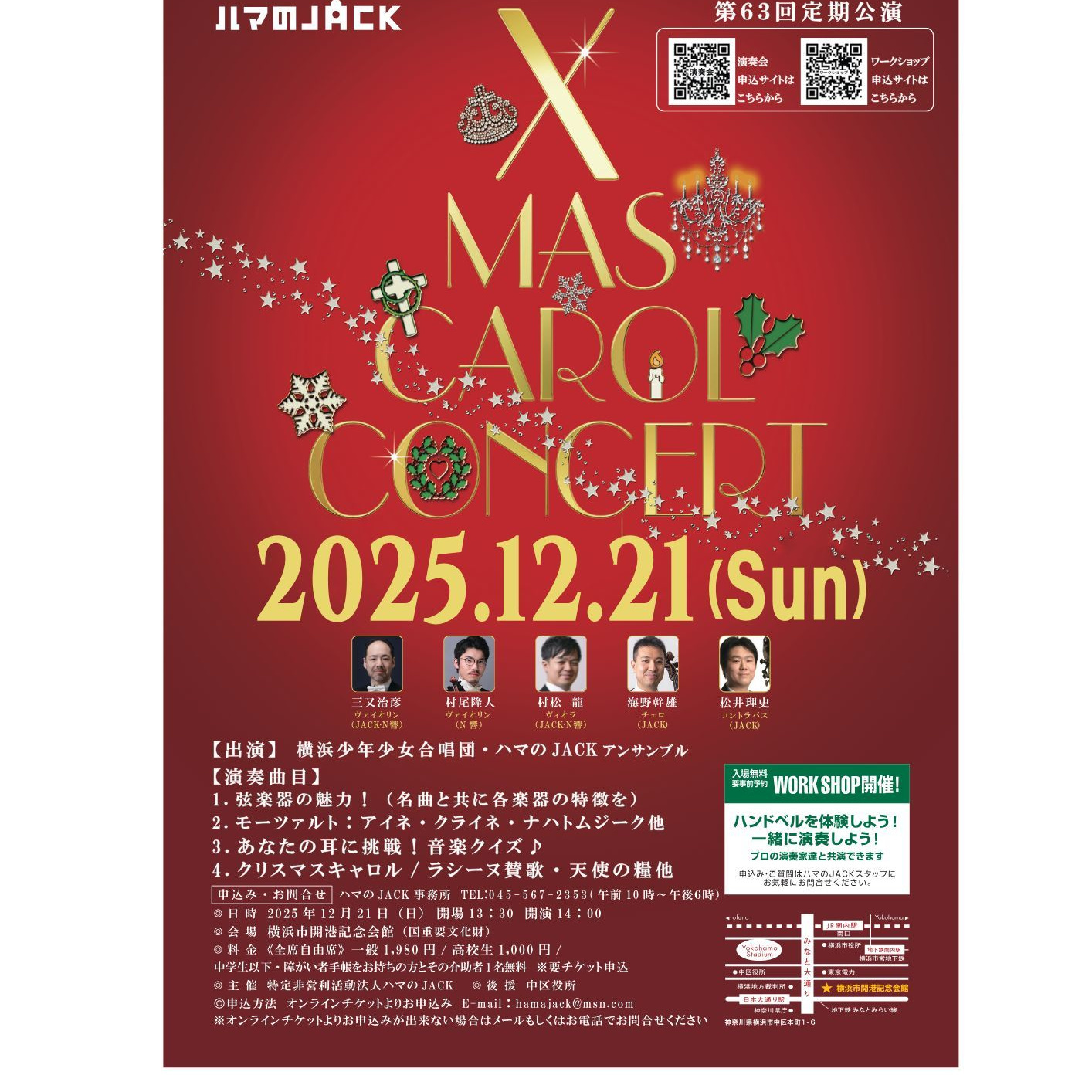 ハマのJACKがお届けする演奏会 金の卵見つけました演奏会 コンチェルトソリストオーディション合格者による演奏会 コンチェルトソリストオーディションにて合格した小さなソリスト《金の卵たち》が出演する演奏会。 近年では過去の受賞者がOB/OGとして出演。合格後の素晴らしい成長もお聴き頂いております。 またオーディションにてJACK賞を受賞した方による《JACK賞受賞者演奏会》も開催されています。 みなとみらい遊音地 0歳のお子様からご家族みんなで楽しめます 夏休みに、毎年横浜みなとみらいホールで行われている《みなとみらい遊音地》 ハマのJACKのコンサートも毎年、お子様連れのお客様に楽しんで頂いております。 0歳から入れる《おんがくベビーランド》、朗読付きの絵本コンサートや、楽器のことを学びながら 名曲が聴ける《おんがくファミリーランド》などを開催しております。 クリスマスキャロルコンサート ハンドベルワークショップで演奏会を彩ります ハマのJACKの活動の原点となるクリスマスキャロルコンサート。国の重要文化財である《横浜市開港記念会館》にて行っております。近年では別会場でも開催。ハマのJACKアンサンブルと横浜少年少女合唱団が歌うクリスマスキャロルは格別です。開演前にはハンドベルワークショップも行っており、リピーターがとても多い公演です その他の公演 その他、ハマのJACKではご依頼を受けての演奏会も数多く行っております。保育園や学校への訪問演奏や、区主催の記念コンサートなど、様々な編成でお届けします。 ページトップへ 今後予定している演奏会 クリスマスキャロルコンサート@杉田劇場 クリスマスキャロルコンサート@横浜市開港記念会館 金沢区音楽振興事業公演